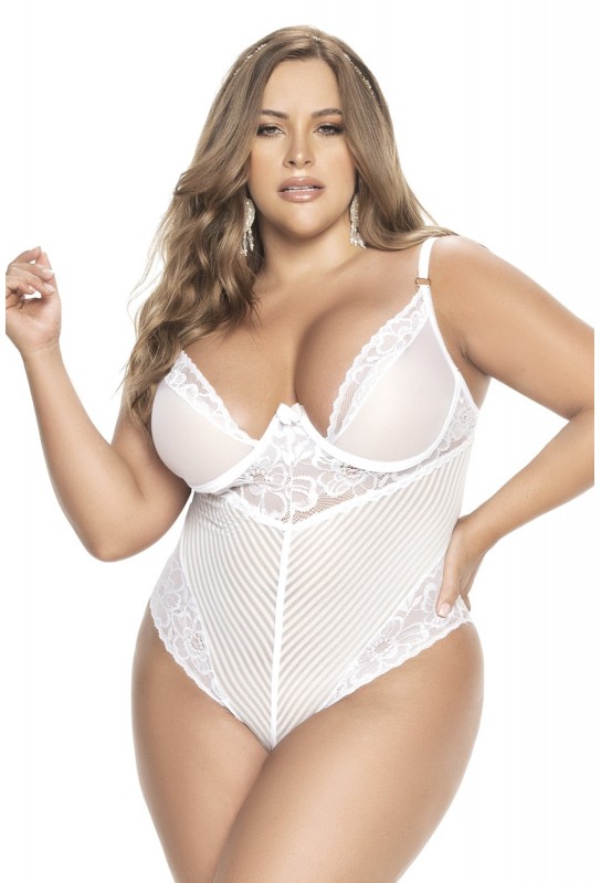 Vous serez son rêve...Devenu réalité avec ce body, grande taille, en fine résille, blanche, rayée et dentelle florale. Soutien-gorge à armatures, grande taille, avec Bretelles réglables. La partie bas se termine en string ouvert. Comprend un porte-jarretelles bas non inclus.