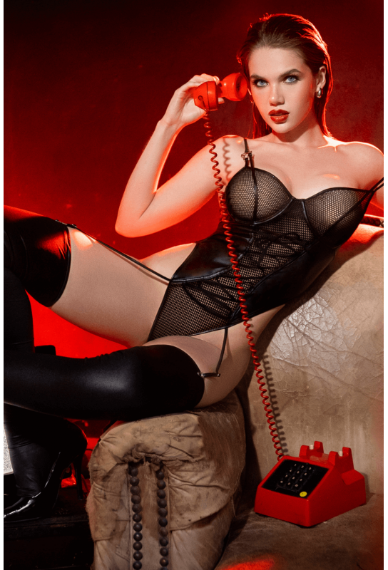 Body sexy en résille graphique et similicuir