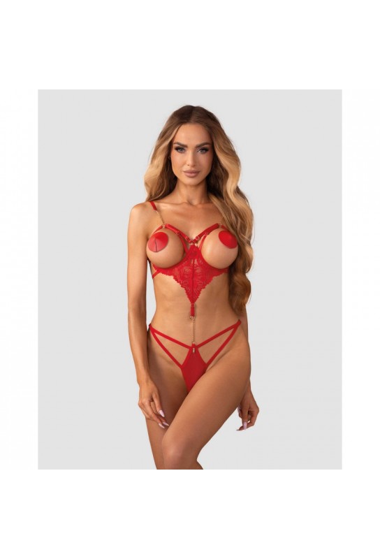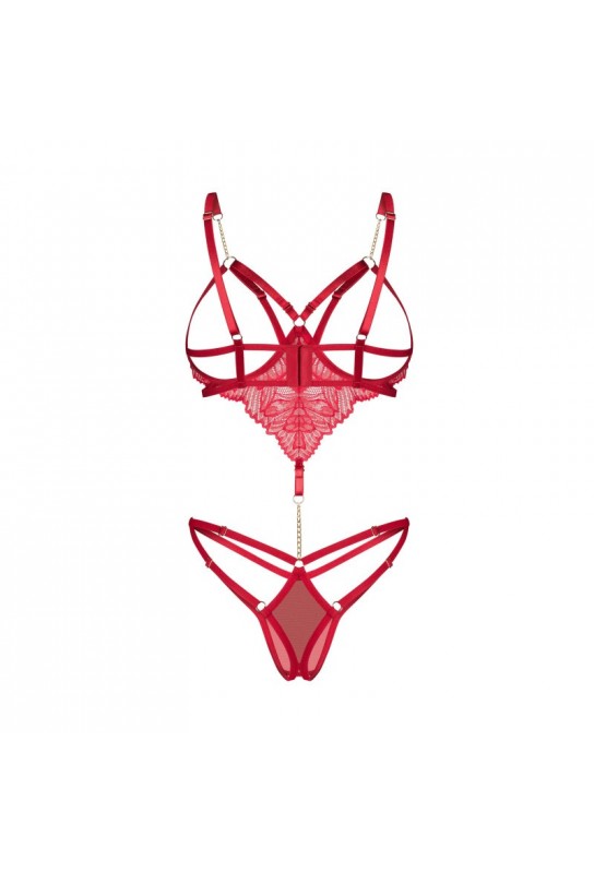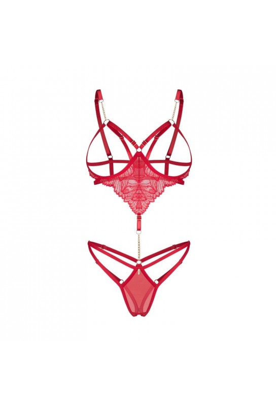 Teddy rouge avec des bonnets ouverts à armatures qui soulèvent doucement le buste. Comprend des bretelles réglables pour un ajustement parfait. Fabriqué à partir de dentelle délicate et de maille. Le devant est orné d’une chaîne dorée qui relie de manière frappante le haut et le bas. Le design à entrejambe ouvert ajoute une touche épicée.
