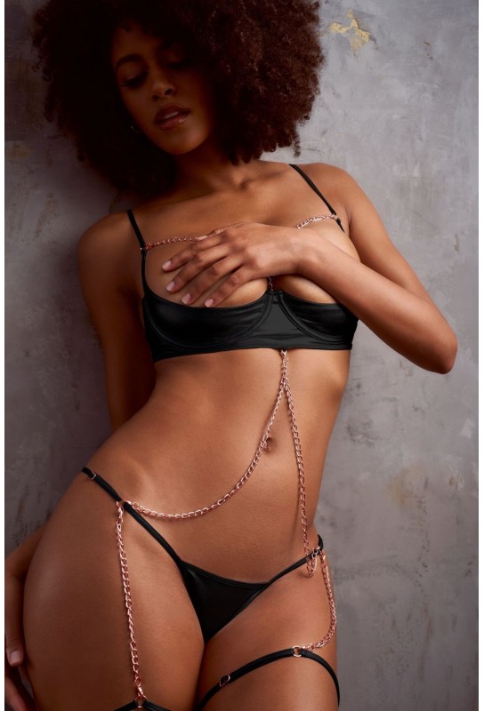 Ensemble de lingerie en tissu noir audacieux effet mouillé avec des détails en chaîne couleur rose gold. Comprend des bretelles et porte-jarretelles réglables ainsi qu'un design à bonnets ouverts. Chaînes amovibles.
