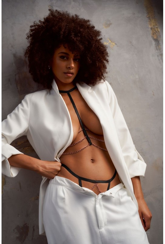 Associez-le à une tenue chic ou portez-le directement sur votre peau nue. Vous vous sentirez au summum de la sensualité avec cet ensemble deux pièces en chaînes couleur rose gold. Comprend un haut réglable et une culotte ouverte dans le dos