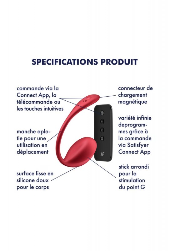 Oeuf vibrant portable et flexible, spécialement conçu pour la stimulation du point G. Grâce à son design ergonomique et à son silicone médical ultra-doux, il s’adapte confortablement au corps tout en transmettant des vibrations puissantes et profondes. Utilisable en solo ou en couple, il se contrôle aussi bien avec la télécommande sans fil incluse qu’avec l’application gratuite Satisfyer Connect.