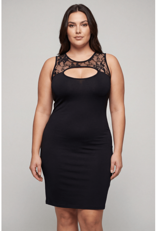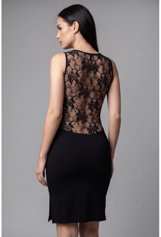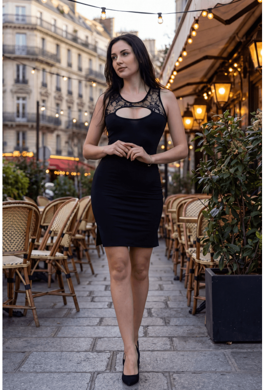 Robe sexy noire qui joue entre opacité et transparence dans un jeu de sensualité. Tissu noir élastique pour épouser votre silhouette. Ouverture sur le haut de la poitrine, simplement pour vous laisser imaginer cette belle poitrine. Le tout en dentelle florale. Le dos ne vous laissera pas insensible avec sa touche dentelle florale.