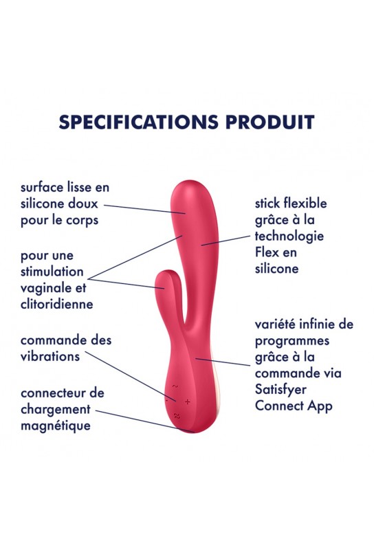 Le Satisfyer Mono Flex combine élégance, technologie et plaisir intense. Doté de 2 moteurs puissants et indépendants, il stimule simultanément le point G et le clitoris pour des orgasmes explosifs. Grâce à sa technologie Silicone Flex, son corps souple s’adapte parfaitement à vos courbes pour une expérience confortable et excitante. Utilisable avec ou sans l’application gratuite Satisfyer Connect App, ce rabbit vibrator ouvre la porte à une infinité de possibilités, dont la création de programmes personnalisés et même la synchronisation avec vos playlists Spotify.