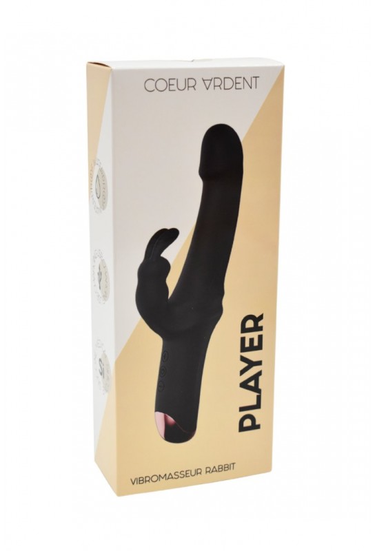 PLAYER , Vibromasseur Rabbit en silicone, de couleur Noir avec 10 modes de vibration. Le vibromasseur Rabbit PLAYER est doté d'un moteur puisant qui vous permettra d'obtenir des sensations graduées et des orgasmes forts à intenses.