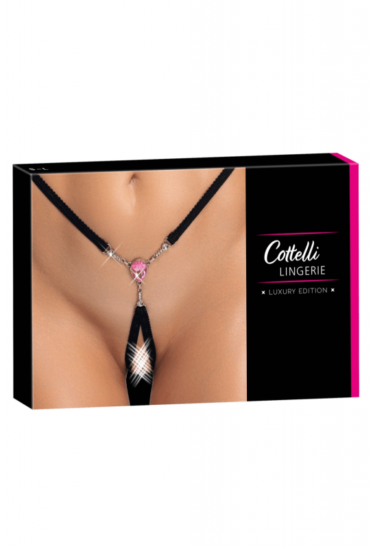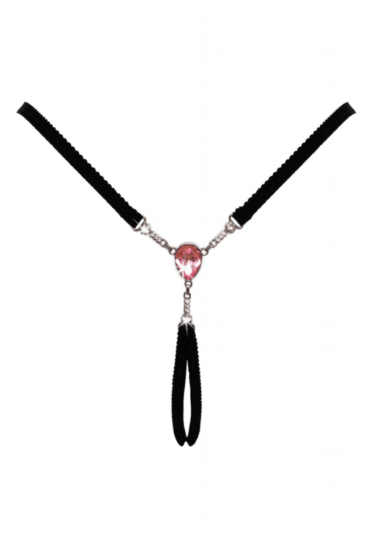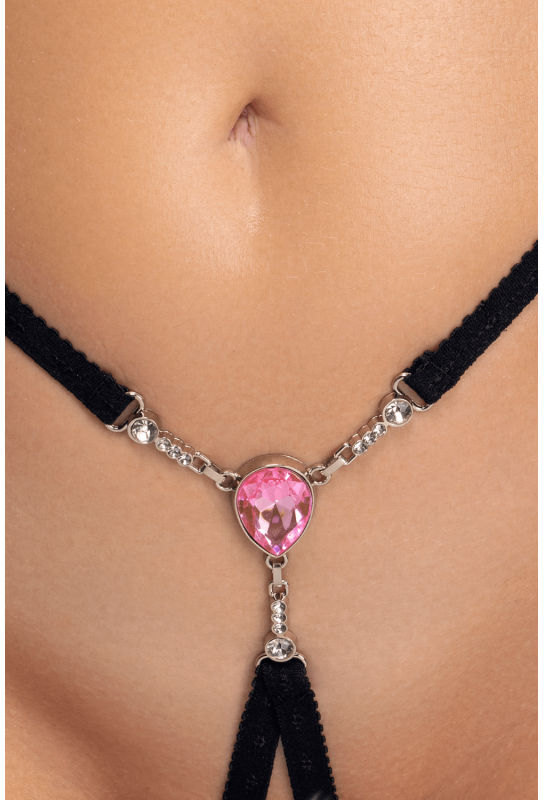 À l’avant, une grande pierre décorative rose attire le regard, accompagnée de chaînettes argentées ornées de petites pierres scintillantes pour une finition élégante et sensuelle.